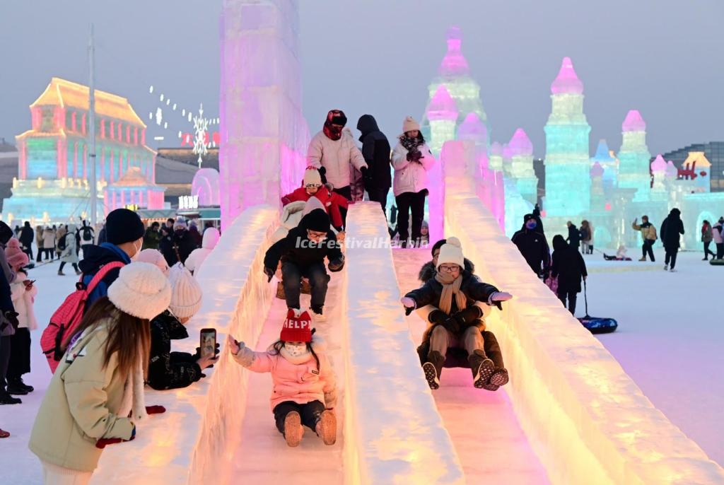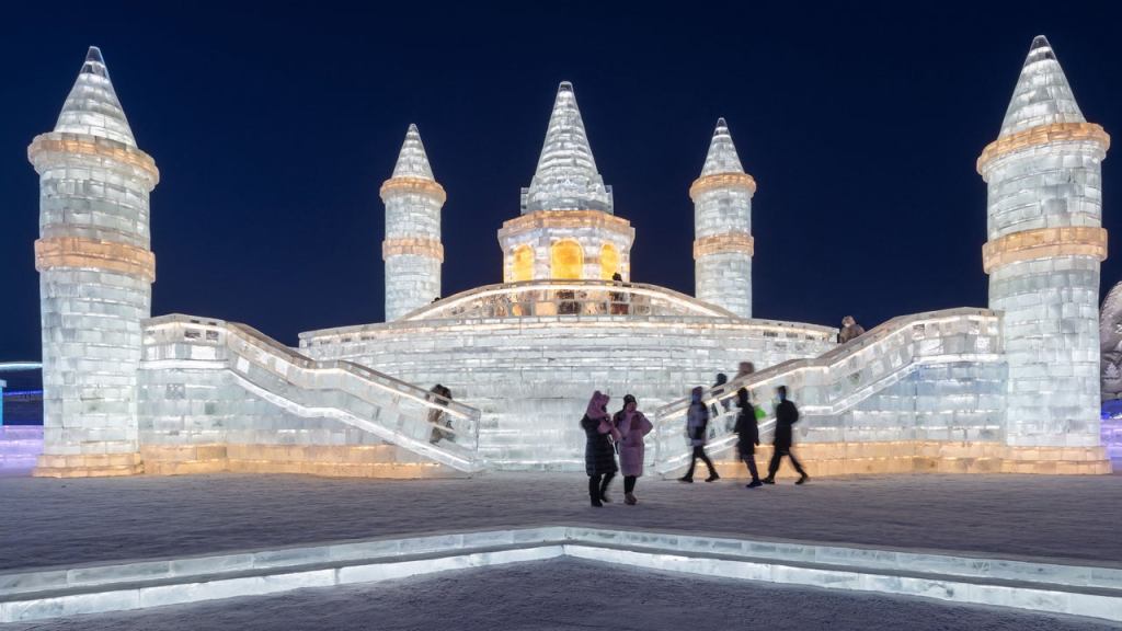 Harbin, China is way up north with a really cold winter. Rather than let the weather get them down, the people there take the icy winter and turn it into a festival. It would be hard to explain what they build so there are pictures on this page. The things they build can be quite large. Use the people for size perspective.